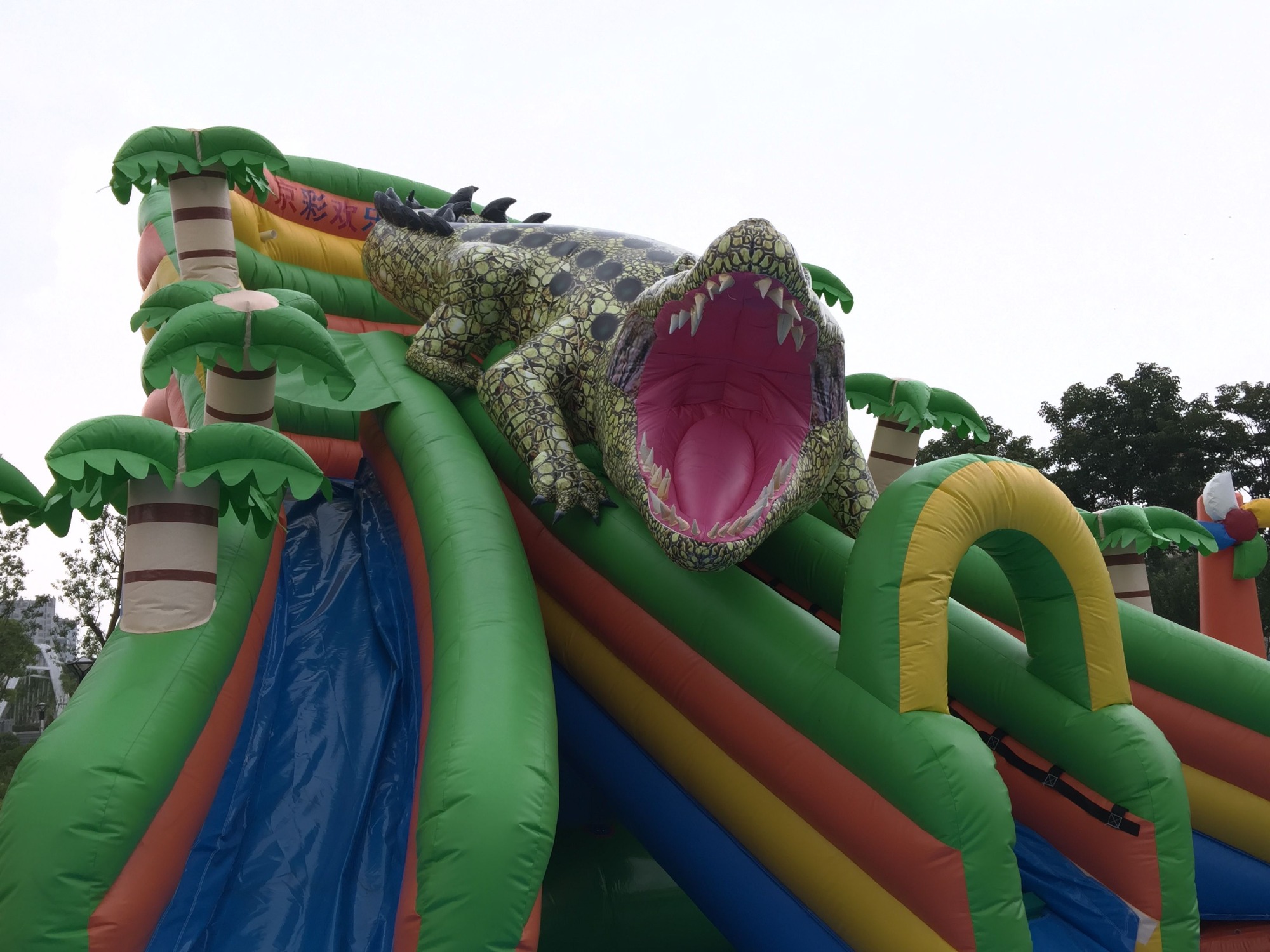 Massive 19.6m×17m×6.5m Water Wonderland Dominate summer events with this vibrant tropical-themed water park featuring multi-color slides, a realistic crocodile top design, and palm tree accents in bold green, blue, yellow, and orange.